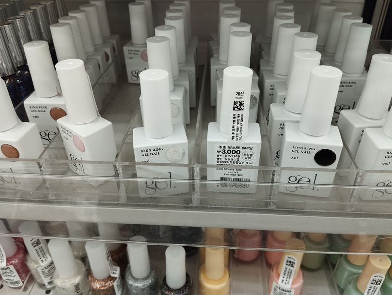 링링브랜드는 저렴한 천 원짜리 제품이 있고 링링 젤이라는 브랜드로 삼천 원짜리 제품군이 구분되어 있습니다. 3,000원짜리 링링젤의 경우는 흰색 네모난 병에 담겨있는 제품으로 컬러는 제품 밖에 있는 색깔로 확인할 수 있습니다. 갈색과 분홍색, 검은색 등 적지 않은 컬러가 있습니다.
